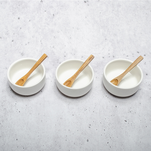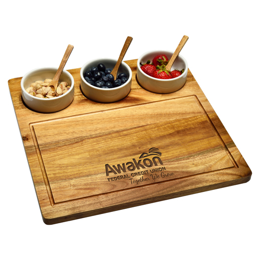 Square Acacia serving tray with three ceramic bowls and three small Acacia serving spoons. Elegant juice groove detail and non slip feet.