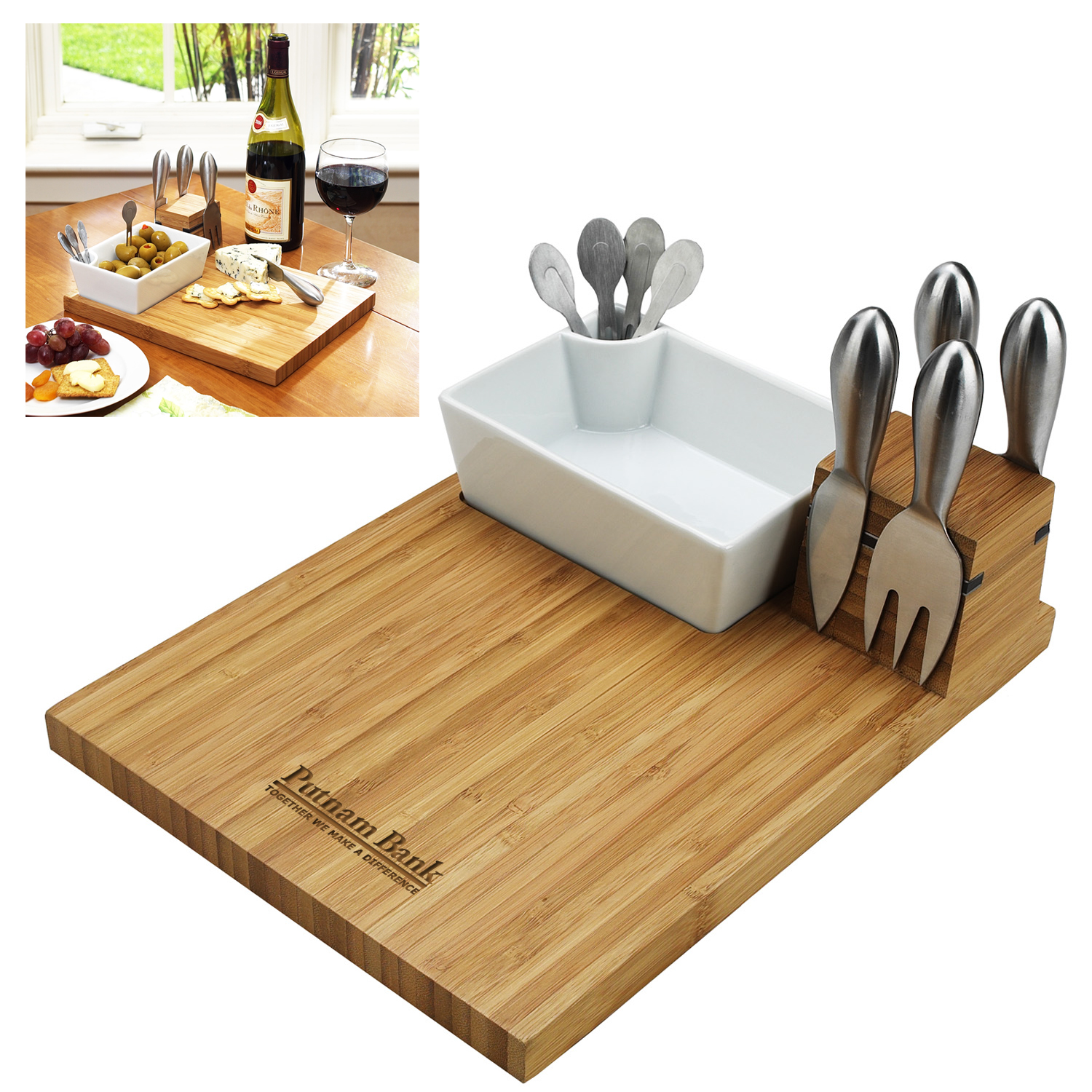 The Buxton cheese board set, includes: Stainless steel serving tools, Cheese Knives (2), Cheese spreaders (1), Cheese fork (1), also includes removable ceramic dish with 4 stainless cocktail sticks for olives and appetizers. Magnetic strip neatly holds tools when not in use.