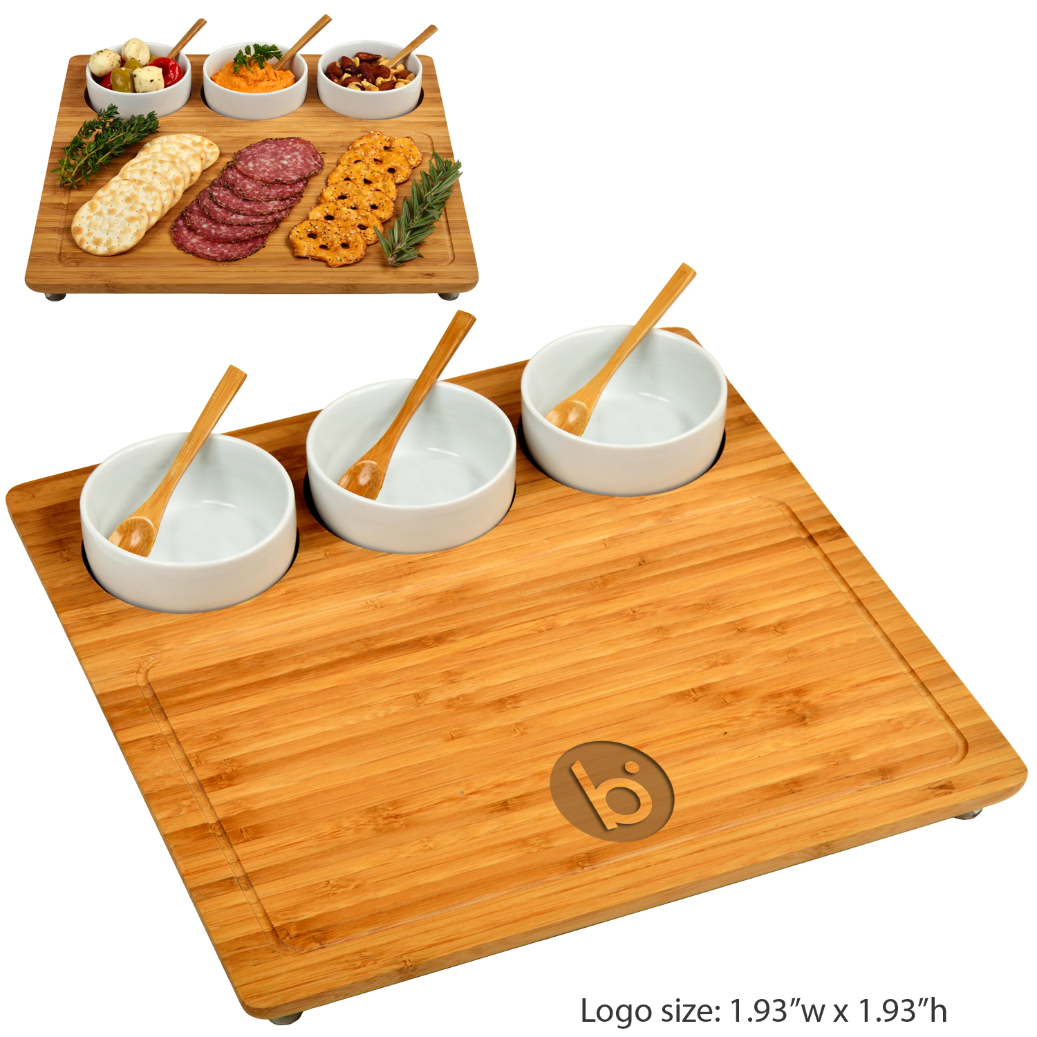 Square bamboo serving tray with three ceramic bowls and three small bamboo serving spoons. Elegant juice groove detail and non slip feet.