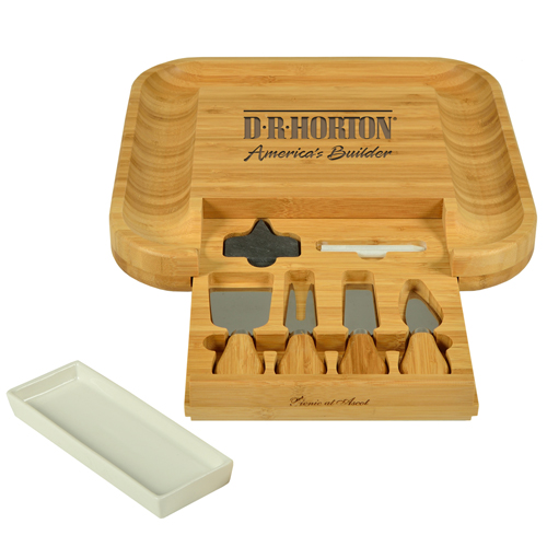 Impressive cutting board set complete with three natural slate cheese markers, two piece of soapstone chalk, four stainless steel cheese tools, and one ceramic dish.