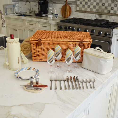 The Dorset English style picnic basket for four is made to last with quality construction and stylish details. Beautifully hand crafted using full reed willow, each basket includes ceramic plates, glass wine glasses, and the highest quality accessories. Includes: (4) ceramic plates, glass wine glasses, stainless flatware, cotton napkins, (1) food cooler, insulated wine pouch, hardwood cutting board, spill proof salt & pepper shakers, wood handle cheese knife, stainless waiters corkscrew, and 50" x 60" acrylic blanket. Natural Willow with leather handle, closures, hinge covers. Lifetime Warranty.