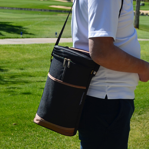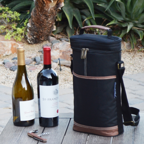 Featuring Thermal Shield ™ insulation this attractive two bottle cooler comes with a combination corkscrew. Durable 600D canvas construction with antique brass accents. Designed and assembled in the USA. Lifetime warranty.