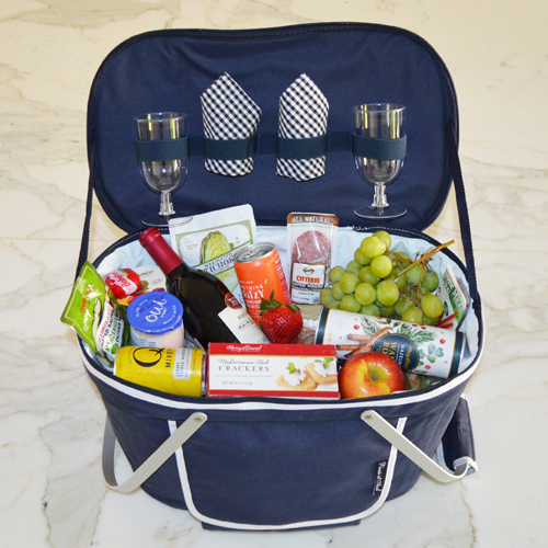 Our new collapsible picnic basket with place settings for 2, is both elegant and practical. Constructed with a lightweight aluminum frame and handles it is durable and easy to collapse and open. Features include a waterproof PEVA lining, Thermal Shield™ insulation system, and padded hand grip. Picnic components fit neatly in front and back external pockets, leaving the cooler area unobstructed, for easy packing. The lid zips fully closed and is insulated as well for maximum cooler efficiency. Includes: (2)each 9" plates, stainless flatware, acrylic wine glasses, and cotton napkins.Great for all outdoor events. Designed and Assembled in the USA. Lifetime Warranty. (U.S. Patent No. D642,870)