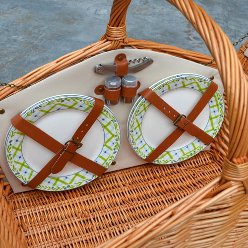 The Huntsman Picnic Basket has a traditional style. Hand crafted using full reed willow, this generously sized basket is made to last. Easy to pack, carry, and enjoy, it includes quanlity components including ceramic plates and glass wine glasses. Includes: (4) ceramic plates, glass wine glasses, stainless flatware, cotton napkins, double walled insulated coffee mugs(1) food cooler, insulated wine pouch, hardwood cutting board, spill proof salt & pepper shakers, wood handle cheese knife, stainless waiters corkscrew, and 24oz stainless steel vacuum flask. Natural Willow with leather straps, closures, hinge covers.