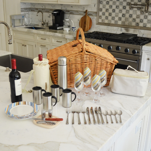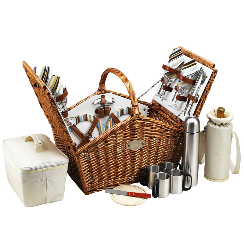 The Huntsman Picnic Basket has a traditional style. Hand crafted using full reed willow, this generously sized basket is made to last. Easy to pack, carry, and enjoy, it includes quantity components including ceramic plates and glass wine glasses. Includes: (4) ceramic plates, glass wine glasses, stainless flatware, cotton napkins, double walled insulated coffee mugs(1) food cooler, insulated wine pouch, hardwood cutting board, spill proof salt & pepper shakers, wood handle cheese knife, stainless waiters corkscrew, and 24oz stainless steel vacuum flask. Natural Willow with leather straps, closures, hinge covers.
