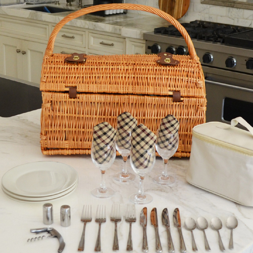 Unique hand crafted deluxe picnic basket in full reed willow with attractive dome top shape & top carry handle. Includes a premium picnic set for four with ceramic plates, matching cotton napkins, glass wine glasses, stainless steel flatware, corkscrew, and no spill salt & pepper shakers. Also includes a convenient food cooler.