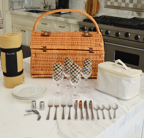 Unique hand crafted deluxe picnic basket in full reed willow with attractive dome top shape & top carry handle. Includes a premium picnic set for four with ceramic plates, matching cotton napkins, glass wine glasses, stainless steel flatware, corkscrew, and no spill salt & pepper shakers. Also includes a convenient food cooler and 50" x 60" fleece blanket with carrier.