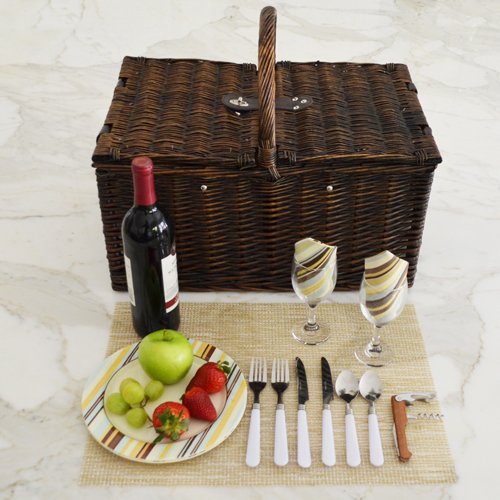 Traditional full reed willow handcrafted Picnic basket for two with a rich chocolate brown finish. It has a traditional picnic basket shape and convenient top carry handle. This set includes coordinating melamine plates and cotton napkins, glass wine glasses, stainless steel flatware, and corkscrew. Also includes a convenient food cooler.