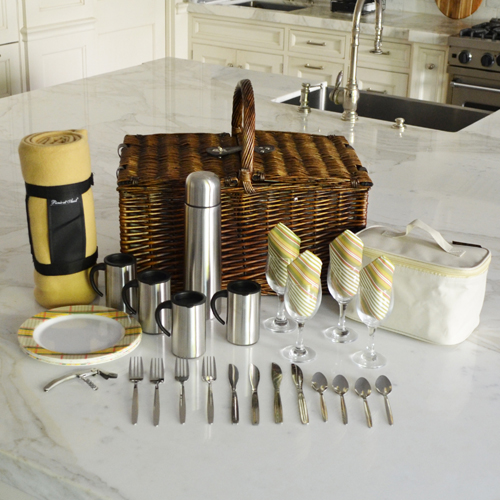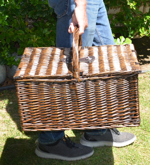 Traditional full reed willow handcrafted Picnic basket for four with a rich chocolate brown finish. It has a traditional picnic basket shape and convenient top carry handle. This set includes coordinating melamine plates and cotton napkins, glass wine glasses, stainless steel flatware, and corkscrew. Also includes a convenient food cooler, coffee set with stainless steel coffee flask and mugs, and 50"x 60" fleece blanket with carrier.