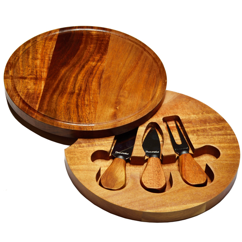 The Feta round cheese board set with hidden swivel base with tools. Includes three stainless steel serving utensils with acacia handles. Convenient compact size and juice groove detail. Great to take along to an outdoor picnic and makes an excellent gift. Natural acacia wood.
