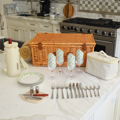 The Dorset English style picnic basket for four is made to last with quality construction and stylish details. Beautifully hand crafted using full reed willow, each basket includes ceramic plates, glass wine glasses, and the highest quality accessories. Includes: (4) ceramic plates, glass wine glasses, stainless flatware, cotton napkins, (1) food cooler, insulated wine pouch, hardwood cutting board, spill proof salt & pepper shakers, wood handle cheese knife, stainless waiters corkscrew, and 50" x 60" acrylic blanket. Natural Willow with leather handle, closures, hinge covers. Lifetime Warranty.