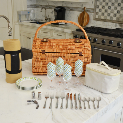 Unique hand crafted deluxe picnic basket in full reed willow with attractive dome top shape & top carry handle. Includes a premium picnic set for four with ceramic plates, matching cotton napkins, glass wine glasses, stainless steel flatware, corkscrew, and no spill salt & pepper shakers. Also includes a convenient food cooler and 50" x 60" fleece blanket with carrier.