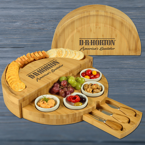 An Ascot original and exclusive, the Tapas Rotating Cheese Set is a Bamboo Board that amazingly transforms from a half circle to a circular, multi level cheese board with three stainless steel tools in a pull out drawer. This ingenious high quality board will impress guests when entertaining, and carry your brand name for years. A unique and very special upscale gift. (U.S. Patent Nos. D925,997 S)