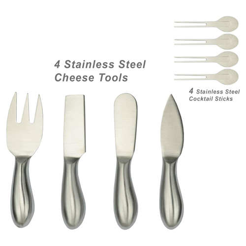 The Buxton cheese board set, includes: Stainless steel serving tools, Cheese Knives (2), Cheese spreaders (1), Cheese fork (1), also includes removable ceramic dish with 4 stainless cocktail sticks for olives and appetizers. Magnetic strip neatly holds tools when not in use.