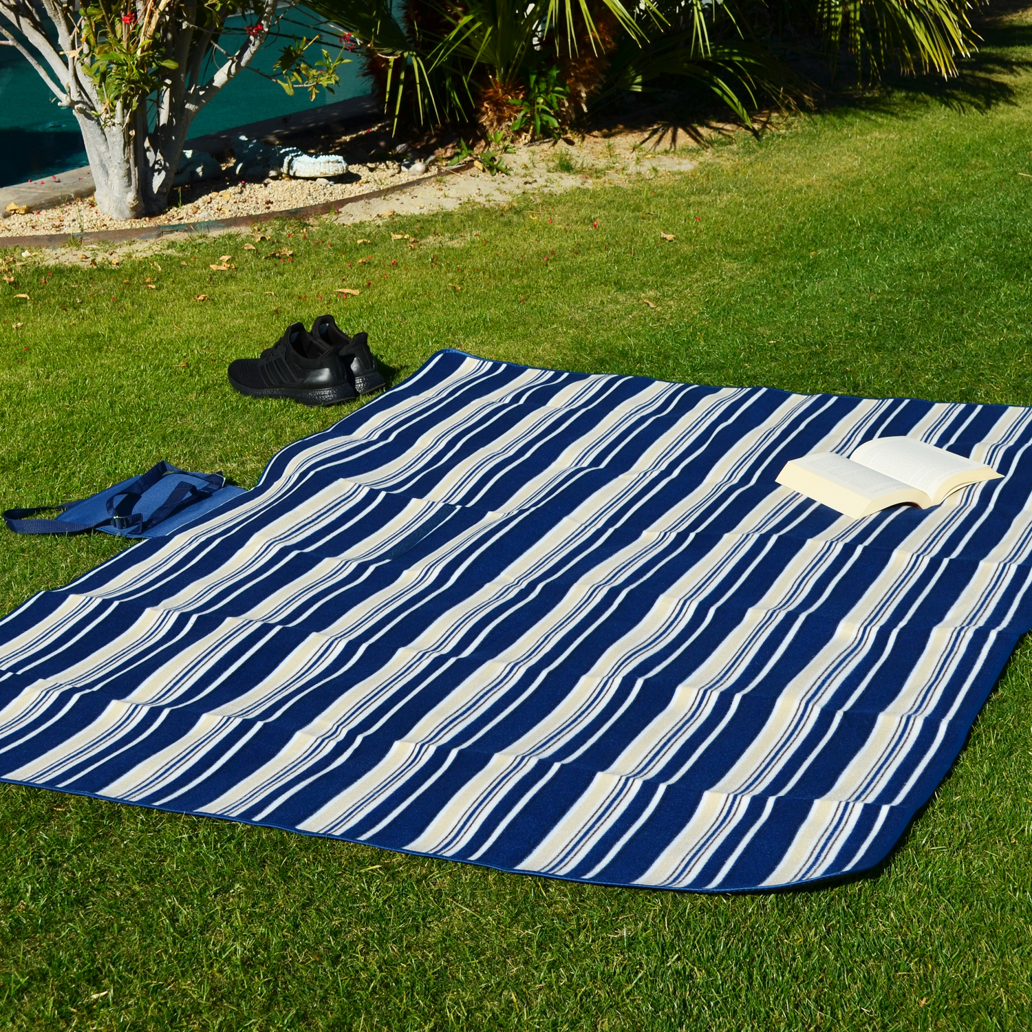 Outdoor picnic blanket with carry handle and adjustable shoulder strap. Self-case with easy velcro closure Polyester fleece with water resistant backing. Blanket Open Dimensions 60” x 80”