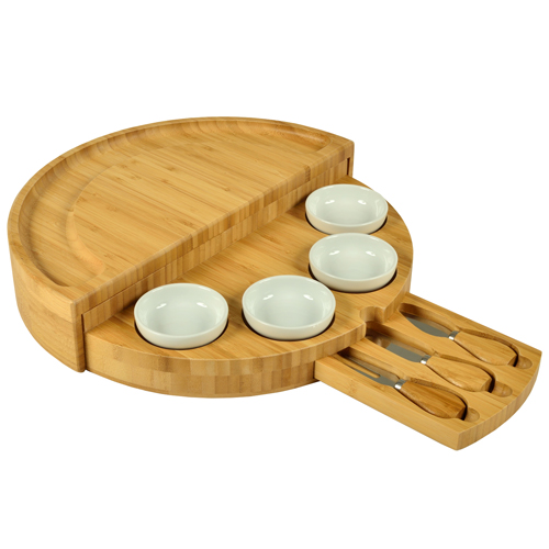 An Ascot original and exclusive, the Tapas Rotating Cheese Set is a Bamboo Board that amazingly transforms from a half circle to a circular, multi level cheese board with three stainless steel tools in a pull out drawer. This ingenious high quality board will impress guests when entertaining, and carry your brand name for years. A unique and very special upscale gift. (U.S. Patent Nos. D925,997 S)