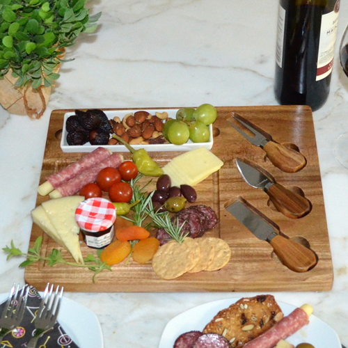 The elegant Celtic cheese board set includes a removable ceramic dish for crackers, olives, etc. and three cheese service utensils. Utensils are stainless steel with acacia handles; (1) Cheese Knive (1), Cheese spreaders (1), Cheese fork - all inset in cheese board.