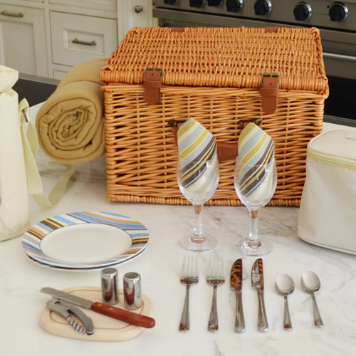 The quality and sophistication of the English style Cheshire Picnic Basket for two is sure to impress. Beautifully hand crafted using full reed willow, each basket includes ceramic plates, glass wine glasses, and the highest quality accessories. Includes: (2) ceramic plates, glass wine glasses, stainless flatware, cotton napkins, (1) food cooler, insulated wine pouch, hardwood cutting board, spill proof salt & pepper shakers, wood handle cheese knife, stainless waiters corkscrew, and 50" x 60" fleece blanket. Natural Willow with leather handle, closures, hinge covers. Lifetime Warranty.