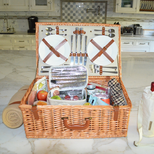 The Dorset English style picnic basket for four is made to last with quality construction and stylish details. Beautifully hand crafted using full reed willow, each basket includes ceramic plates, glass wine glasses, and the highest quality accessories. Includes: (4) ceramic plates, glass wine glasses, stainless flatware, cotton napkins, (1) food cooler, insulated wine pouch, hardwood cutting board, spill proof salt & pepper shakers, wood handle cheese knife, stainless waiters corkscrew, and 50" x 60" acrylic blanket. Natural Willow with leather handle, closures, hinge covers. Lifetime Warranty.
