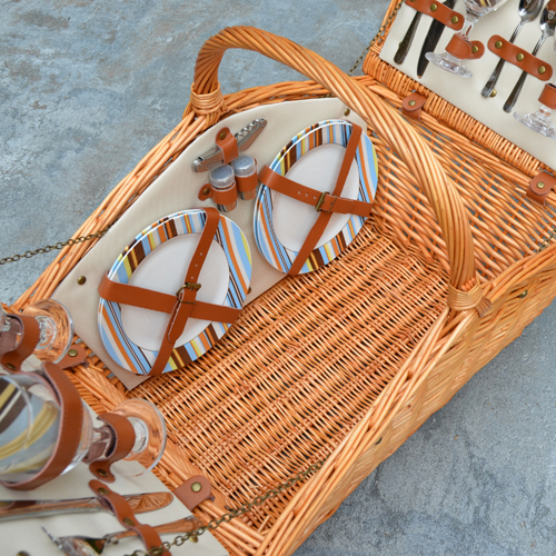 The Huntsman Picnic Basket has a traditional style. Hand crafted using full reed willow, this generously sized basket is made to last. Easy to pack, carry, and enjoy, it includes quality components including ceramic plates and glass wine glasses. Includes: (4) ceramic plates, glass wine glasses, stainless flatware, cotton napkins, (1) food cooler, insulated wine pouch, hardwood cutting board, spill proof salt & pepper shakers, wood handle cheese knife, stainless waiters corkscrew. Natural Willow with leather straps, closure, & hinge covers. Lifetime Warranty.