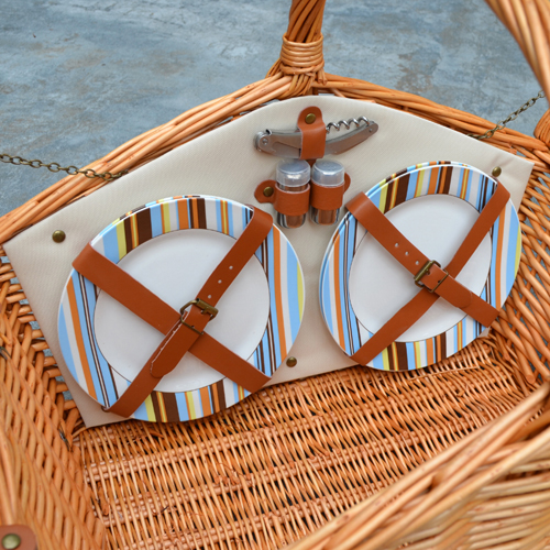 The Huntsman Picnic Basket has a traditional style. Hand crafted using full reed willow, this generously sized basket is made to last. Easy to pack, carry, and enjoy, it includes quantity components including ceramic plates and glass wine glasses. Includes: (4) ceramic plates, glass wine glasses, stainless flatware, cotton napkins, (1) food cooler, insulated wine pouch, hardwood cutting board, spill proof salt & pepper shakers, wood handle cheese knife, stainless waiters corkscrew, and 50" x 60" fleece blanket. Natural Willow with leather straps, closures, hinge covers.