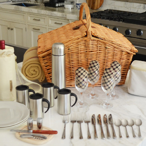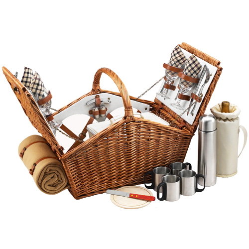 The Huntsman Picnic Basket has a traditional style. Hand crafted using full reed willow, this generously sized basket is made to last. Easy to pack, carry, and enjoy, it includes quantity components including ceramic plates and glass wine glasses. Includes: (4) ceramic plates, glass wine glasses, stainless flatware, cotton napkins, double walled insulated stainless coffee cups and (1) food cooler, insulated wine pouch, hardwood cutting board, spill proof salt & pepper shakers, wood handle cheese knife, stainless waiters corkscrew, 24oz stainless steel vacuum flask, and 50" x 60" fleece blanket. Natural Willow with leather straps, closure & hinge covers. Lifetime Warranty.
