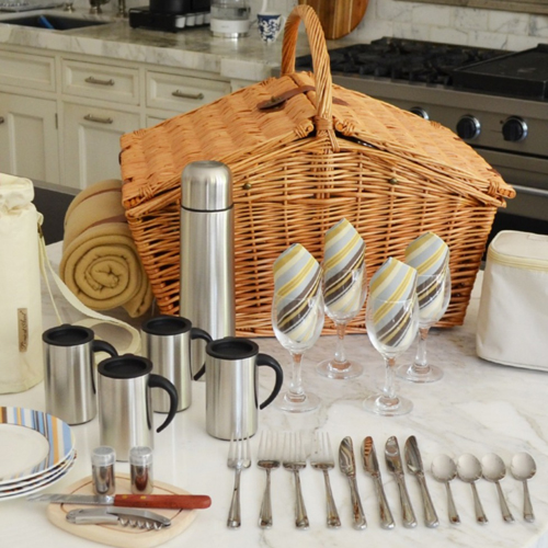 The Huntsman Picnic Basket has a traditional style. Hand crafted using full reed willow, this generously sized basket is made to last. Easy to pack, carry, and enjoy, it includes quantity components including ceramic plates and glass wine glasses. Includes: (4) ceramic plates, glass wine glasses, stainless flatware, cotton napkins, double walled insulated stainless coffee cups and (1) food cooler, insulated wine pouch, hardwood cutting board, spill proof salt & pepper shakers, wood handle cheese knife, stainless waiters corkscrew, 24oz stainless steel vacuum flask, and 50" x 60" fleece blanket. Natural Willow with leather straps, closure & hinge covers. Lifetime Warranty.